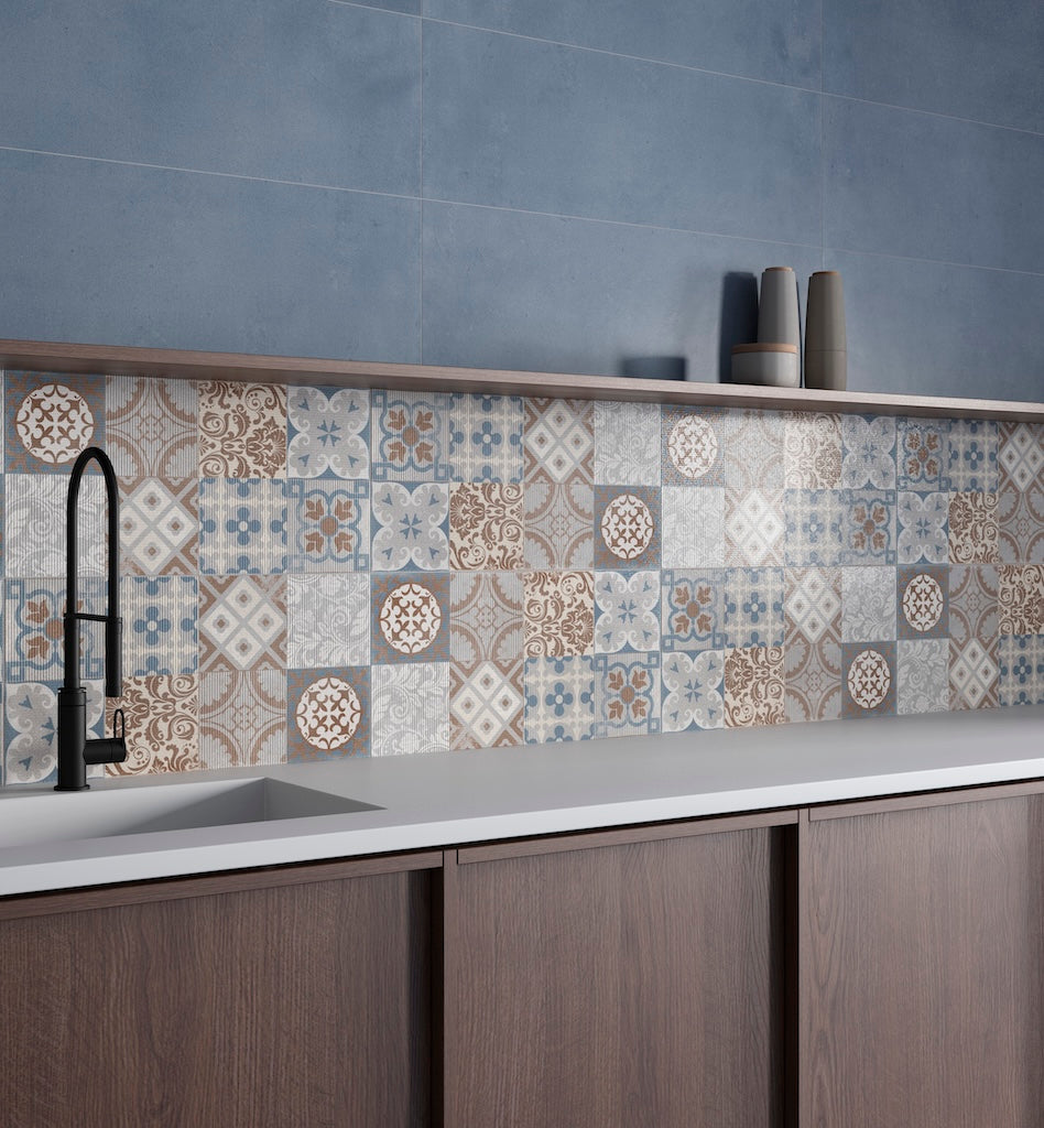 Die matte Oberfläche unterstreicht die natürliche Materialwirkung und sorgt für eine authentische, ruhige Flächenoptik. Das kompakte Format von 15×15 cm ermöglicht vielseitige Gestaltungsmöglichkeiten – von dekorativen Akzentflächen bis hin zu klassischen Fliesenbildern. Durch die Kombination verschiedener grafischer Elemente entsteht eine abwechslungsreiche, handwerklich inspirierte Flächenwirkung.